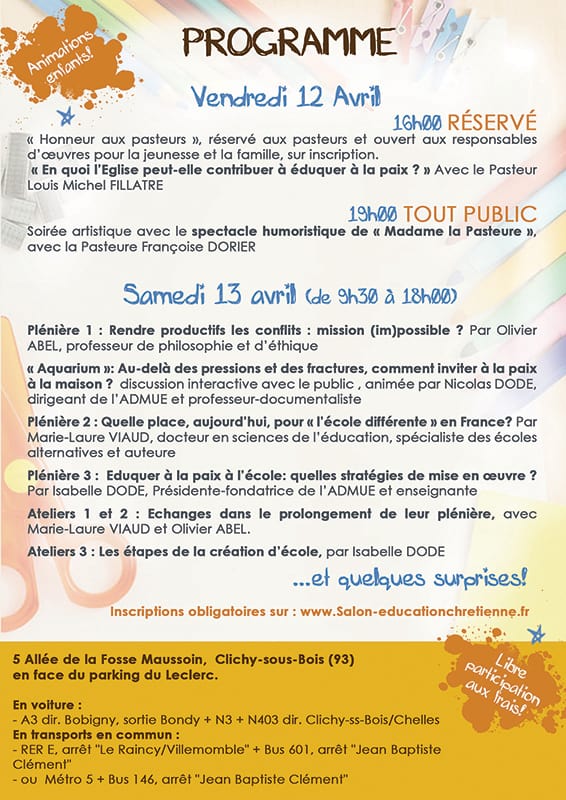 L’association « Dessine-moi une école » (ADMUE) organise pour la 8ième année consécutive un salon sur l’éducation chrétienne. Il est ouvert à tous ceux et celles qui ont ou auront une responsabilité éducative au sein de l’école, la famille et l’église.